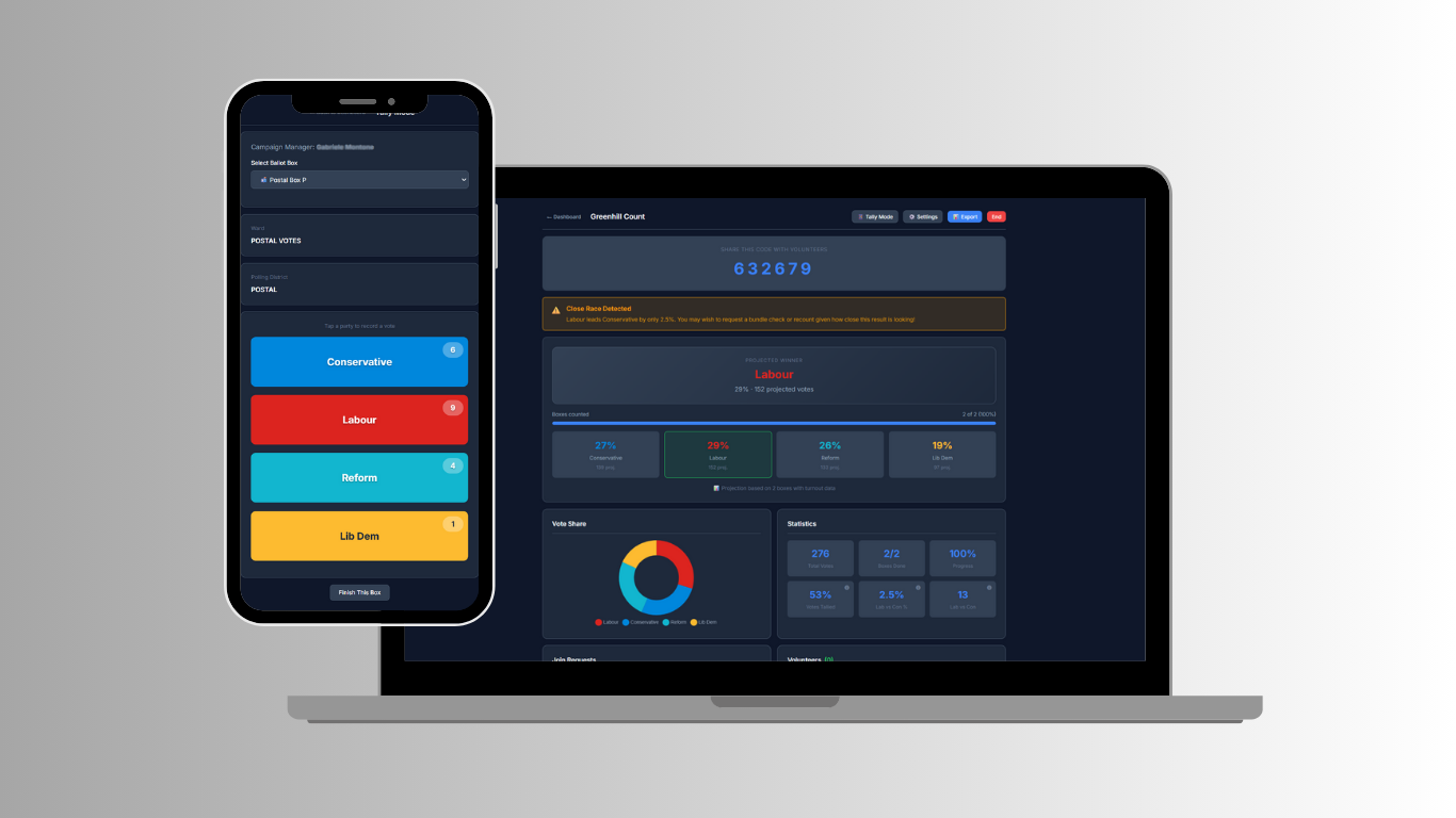 Your campaign manager creates a session. Volunteers join with a 6-digit code. As boxes are counted, every figure syncs instantly to a live dashboard, and our projection engine calculates your estimated final result in real time, based on live turnout data.